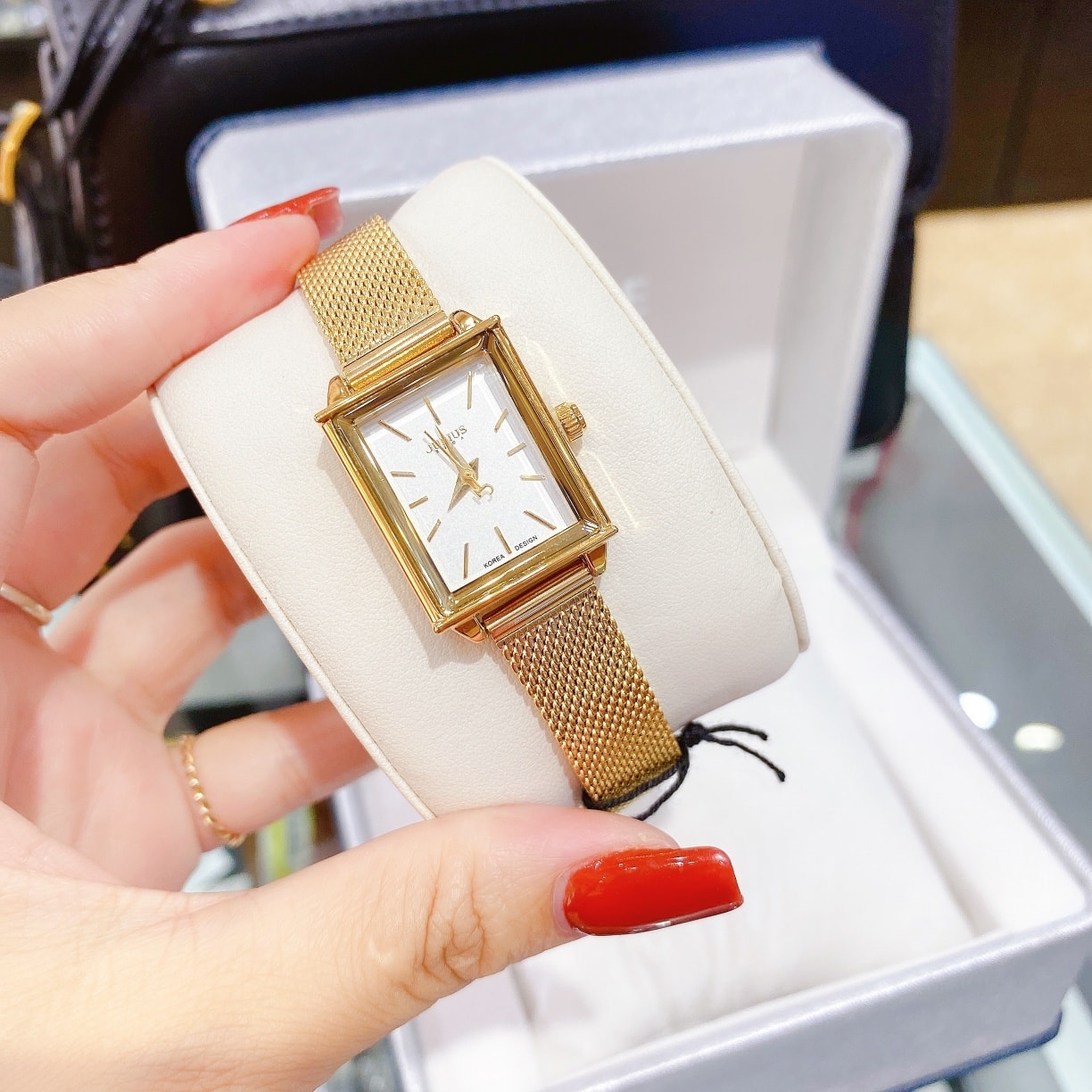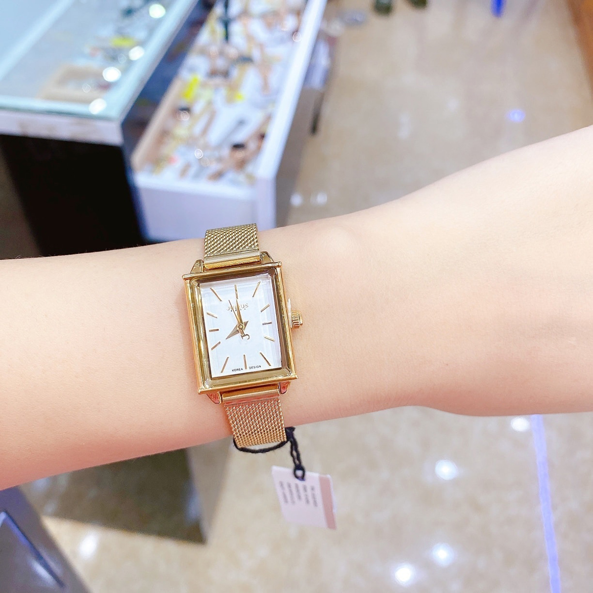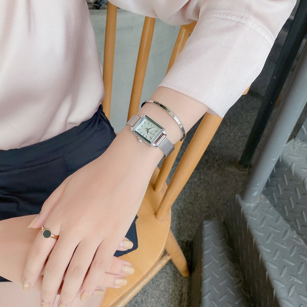 - Điểm nhấn đồng hồ: Mặt kính 3D hình chữ nhật nhỏ xinh